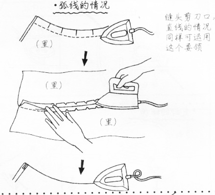 曲線較彎的時(shí)候可以在縫邊上打上幾個(gè)剪口,再劈開(kāi)熨燙: