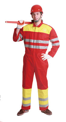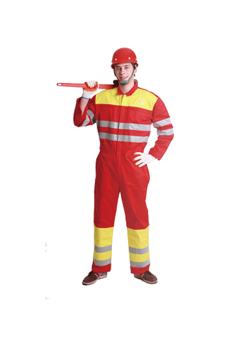 面料:100%純棉,防靜電,防油,防水,20*16,120*60,240GSM;前胸繡花標(biāo)志,前門(mén)襟樹(shù)脂拉鏈,兩個(gè)帶蓋胸兜和兩個(gè)斜插褲兜,后背臀部貼兜,腰部松緊帶,兩條5CM反光條環(huán)繞衣前后,雙臂和雙褲腿。